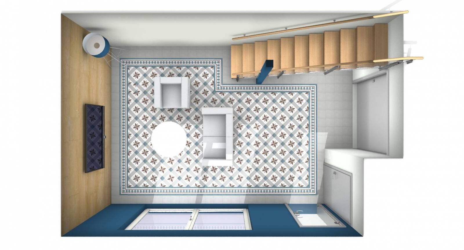 Car chaque revêtement de sol à du caractère et que son implantation permet d’embellir l’espace. La beauté du carreaux ciment associé à l’entretien et la résistance du carrelage fût l’argument pour le choix de ce revêtement de sol en grès cérame émaillé. Afin de créer un lieu agréable et conviviale, nous avons dans un premier temps relevé les côtes de la pièce et ainsi implanté sur un plan en 3D un tapis de carrelage imitation carreaux de ciment. Ce chantier fût réalisé à Bordeaux à la demande de clients particuliers et un carreleur proposé par nos soins, afin de suivre nos plans de A à Z …