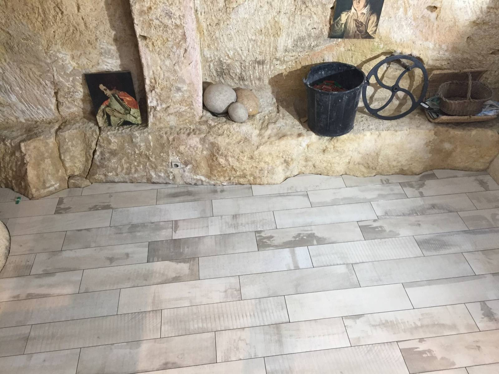 Le choix de notre client c’est porté sur un carrelage imitation bois capable de se marier avec de la pierre apparente ainsi que des pierres ressortant du sol. Le challenge fût pour le carreleur qui a su couper son carrelage de façon à parfaitement suivre la pierre.