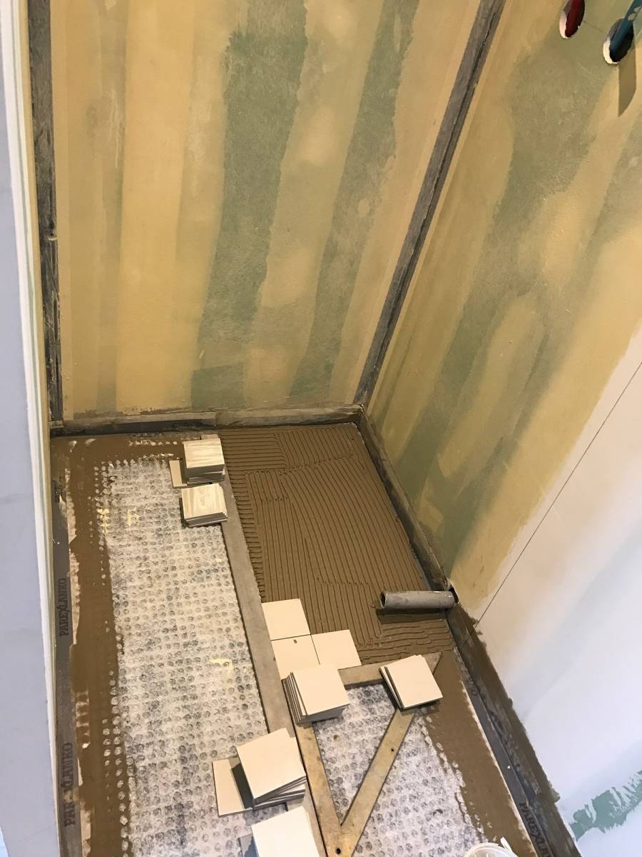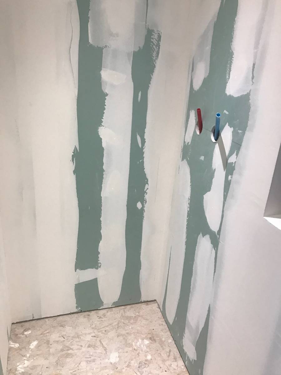 Tandis que pour les murs, dans un espace de douche, il est obligatoire de faire une étanchéité, ici notre artisan a passé un système d’étanchéité à l’eau sous carrelage en pâte dit SPEC. Le SPEC en pâte est un produit d’étanchéité à passer au rouleau en 2 passes croisés avec une intervalle de 12h de séchage, sans oublier de traiter les angles à l’aide de bande de natte d’étanchéité et puis nous pouvons ensuite poser la faïence et la jointer.