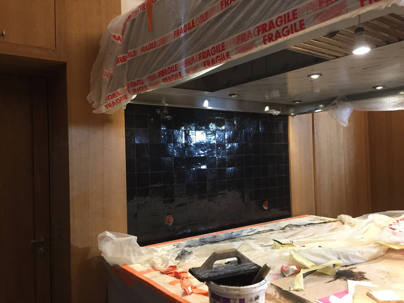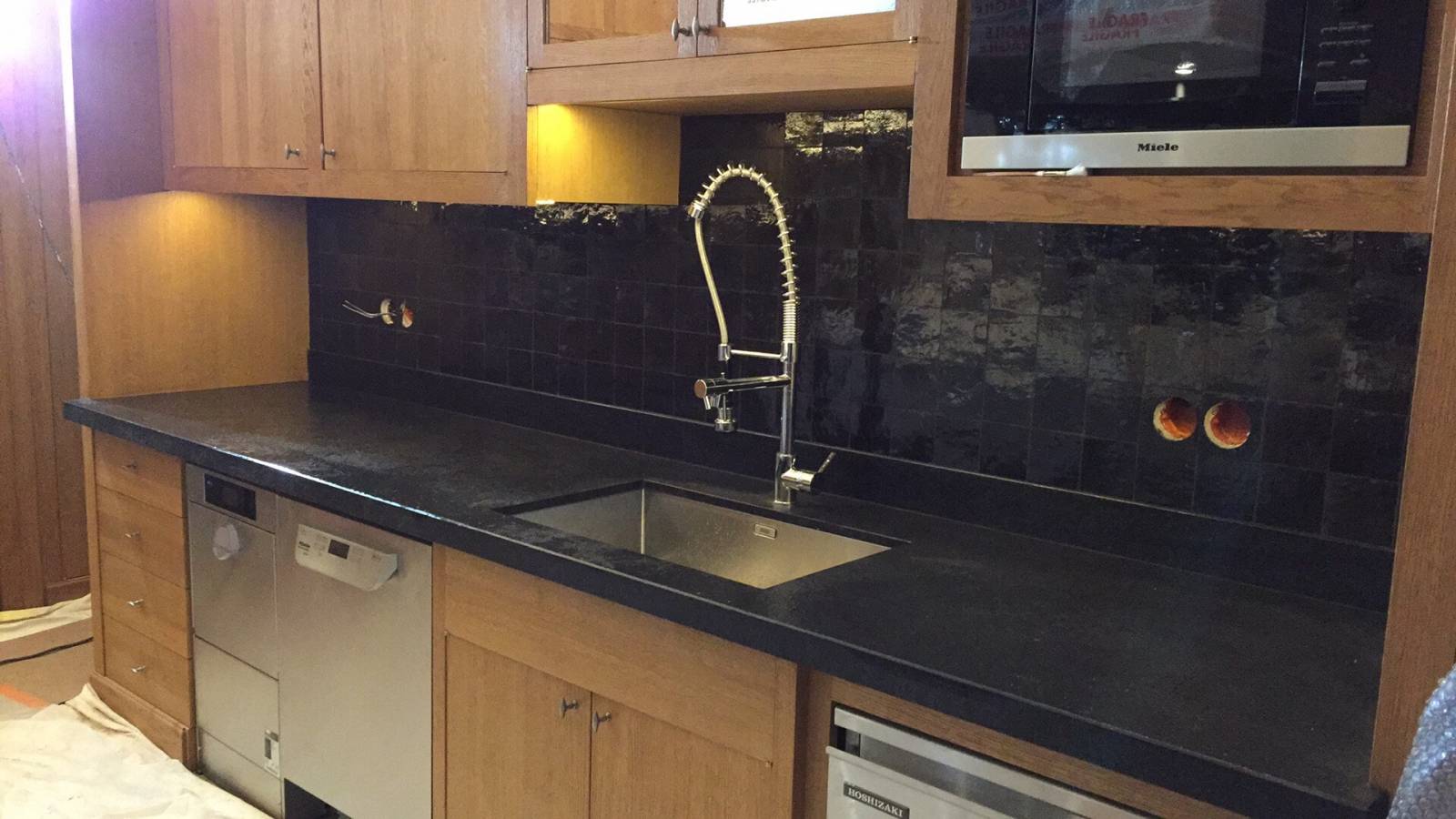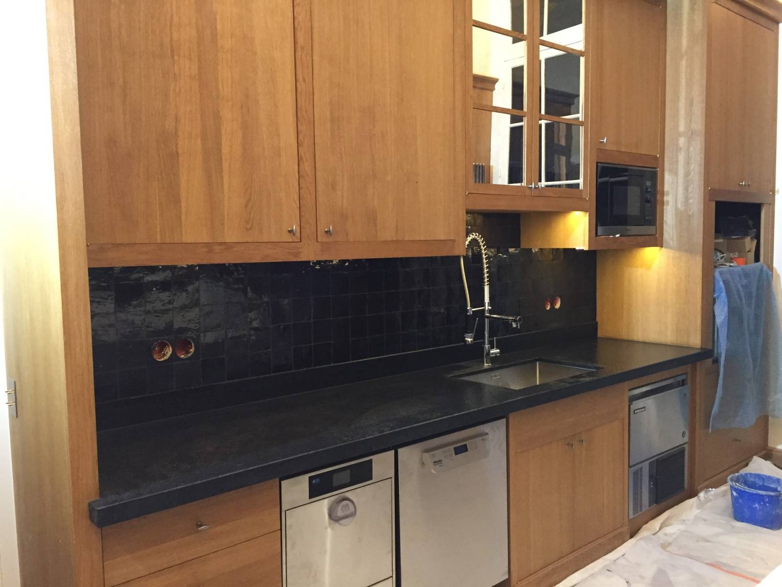 Ici, chez notre client situé près de Montpon-Ménestérol, nous avons fait poser des zelliges par l’un de nos artisans en crédence de cuisine. Le coloris noir est un coloris permettant de faire ressortir les atouts de la cuisine et de contraster.