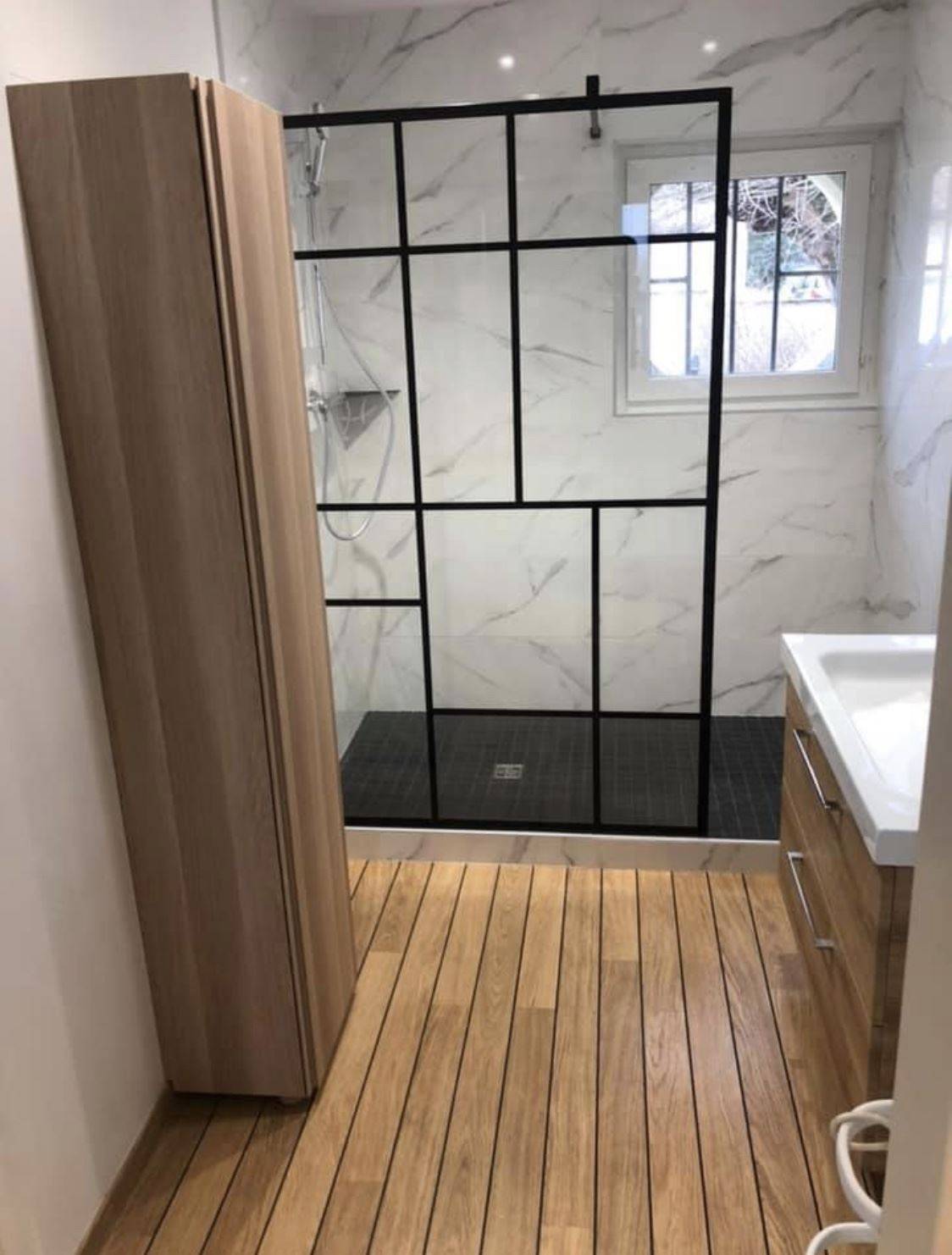 L’association du bois et du carrelage imitation marbre était cette salle d’eau une merveilleuse idée. De plus le rajout de coloris noir s’associe parfaitement avec les joints pont de bateaux. Autres détails qui a de l’importance c’est l’utilisation d’une étagère d’angle noir à inséré dans les joints et une paroi style verrière que nous avons installé chez notre client à Coutras proche de Saint Denis de pile