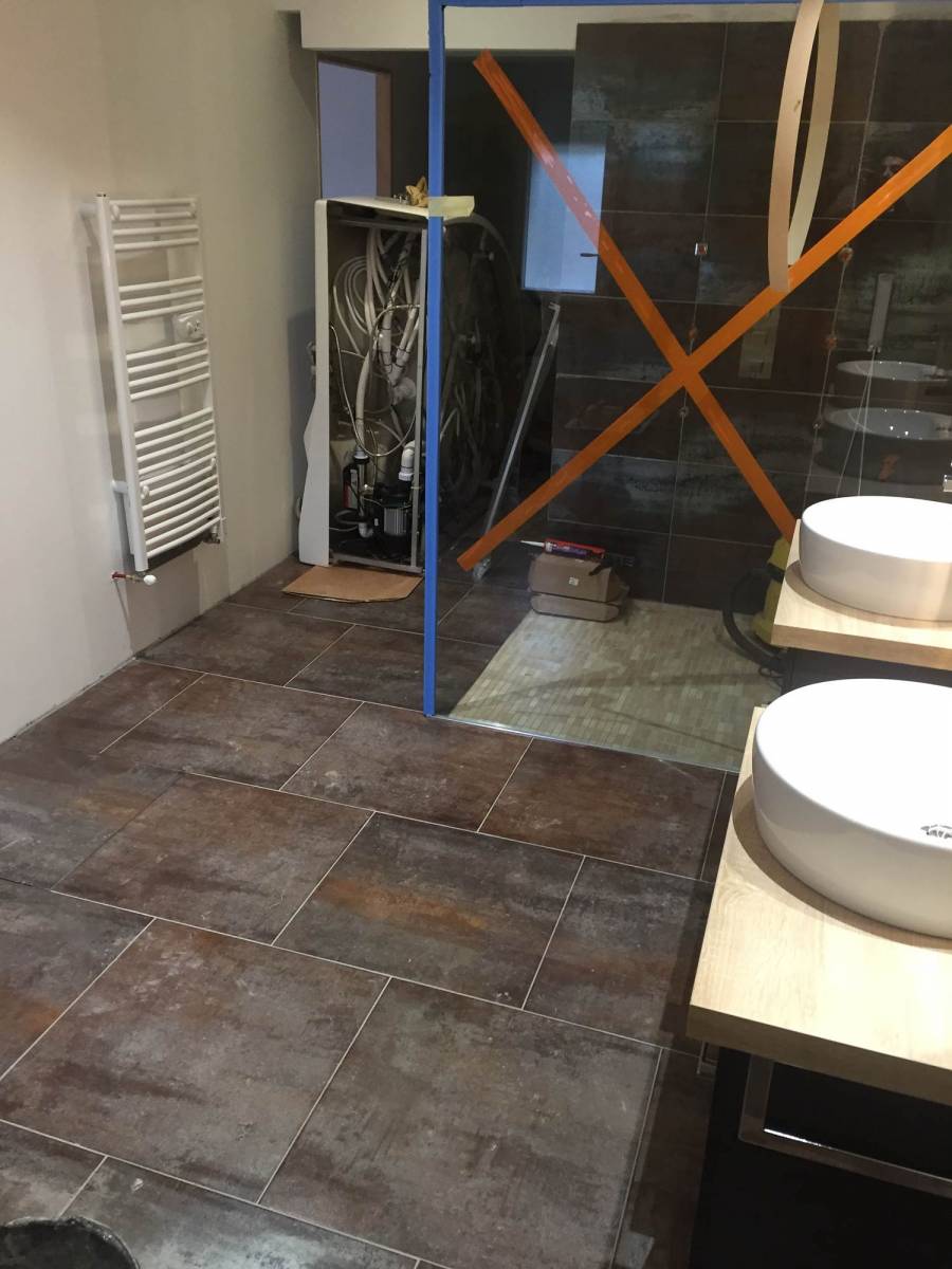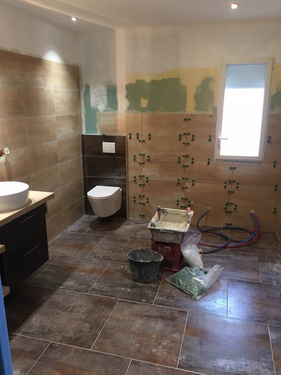 La première étape fût la prise de côte par notre client chez lui à Saint-Émilion, puis suite à un coup de cœur sur le carrelage imitation métal nous l’avons inséré sur le plan en 3D. Nous avons joué sur les contrastes des 2 coloris du carrelage afin de souligner l’espace douche et le toilette suspendu.